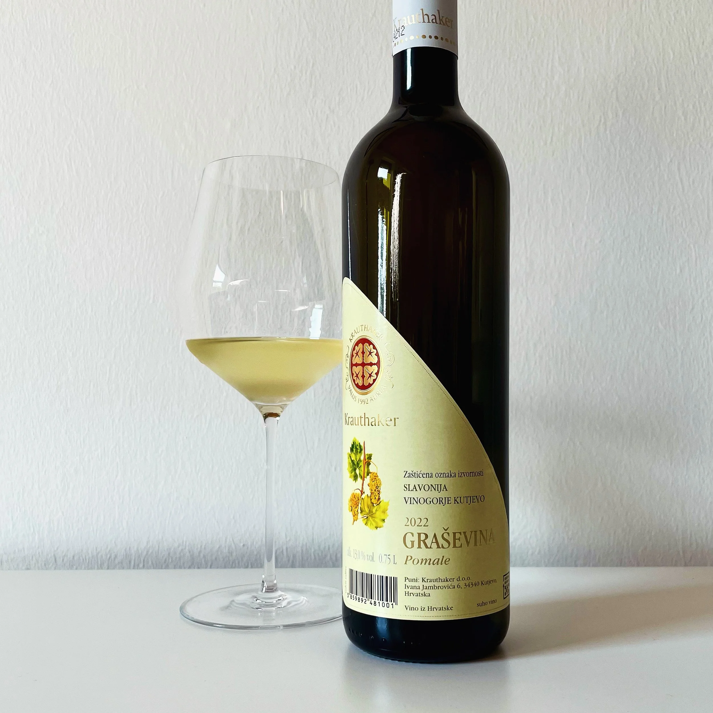 Læskende gyldne dråber fra Slavonien, god Graševina skal man aldrig gå af vejen for. Slavonien er måske mest berømt for sine egetræer, som leverer ved til piemontesernes og toscanernes foretrukne træfade; men den kroatiske region burde være lige så anerkendt for sin rige vinkultur, ikke mindst den lokale specialitet Graševina, som med germansk arrogance oftest kaldes Welschriesling. Vlado Krauthaker er en levende legende i den kroatiske vinbranche og en gudsbenådet fortolker Graševina fra marker rundt omkring den historiske by Kutjevo, eksempelvis Mitrovac, Pomale, Podgorje og Vidim. Pomale laves af lidt senere høstede druer fra en parcel på Mitrovac, og den har en mageløs balance mellem saftighed og frisk frugt på den ene side og moden fylde og rigt ekstrakt på den anden. Milde dufte af hvide blomster og gule æbler følges op af sprød syre og saftig frugt, gule æbler og solmodne abrikoser. Lækker mundfølelse og en fin balance mellem syre, sødme og delikate bitternoter, kamille, akaciehonning, æblekerneolie og marcipan, mineralske undertoner og vedholdende eftersmag.